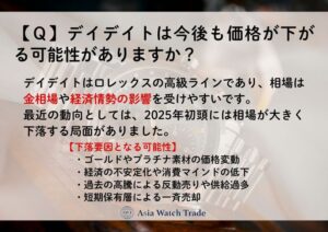 デイデイトはロレックスの中でも特に高級ラインに位置づけられており、相場は金相場や経済情勢の影響を受けやすいモデルです。2025年初頭には相場が大きく下落する局面もありました。