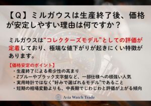 ミルガウスは“コレクターズモデル”としての評価が定着しており、極端な値下がりが起きにくい特徴があります。