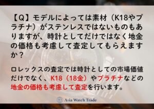 モデルによっては素材(K18やプラチナ)がステンレスではないものもありますが、時計としてだけではなく地金の価格も考慮して査定してもらえますか?