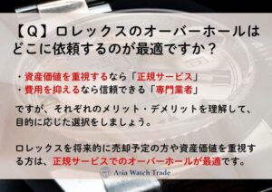 資産価値を重視するなら「正規サービス(日本ロレックス)」、費用を抑えるなら信頼できる「専門業者(非正規修理店)」ですが、それぞれのメリット・デメリットを理解して、目的に応じた選択をしましょう。