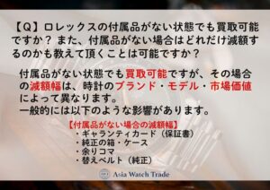 付属品がない場合の減額幅は、時計のブランド・モデル・市場価値によって異なります。一般的には以下のような影響があります。