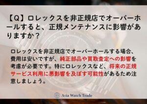 しかし、非正規店でのオーバーホール履歴があると、メーカー保証が無効になることや買取査定額が下がるリスクがあるため、注意が必要です。