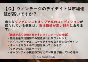 特に1970年代以前に製造されたデイデイトや、ダイヤル・ブレスレット・ベゼルに特徴のあるモデルは、コレクターからの需要も高く、通常の中古相場を大きく上回る価格で取引されることもあります。