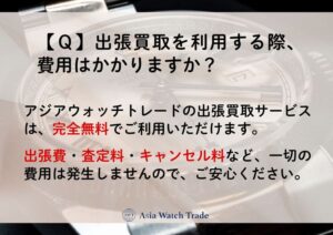 当店では、全国のお客様に便利にご利用いただくため、出張買取の手数料をすべて無料にしています。高級時計の買取は、相場や状態によって価格が変動するため、まずは無料査定をご活用ください。