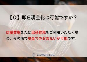 査定結果にご納得いただければ、即日現金でお渡しいたします。高額買取の場合も対応可能ですので、お気軽にご相談ください。
