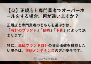正規店と専門業者でオーバーホールをする場合、何が違いますか?
