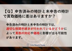はい、申告済みの時計と未申告の時計では、適切な税関手続きが行われているかどうかによって買取の対応や価格に影響が出る可能性があります。