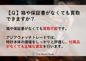 アジアウォッチトレードでは、時計本体の価値をしっかりと評価し、付属品がなくても正確な査定を行います。ただし、以下のような付属品が揃っている場合は、査定額が上がる可能性があります。
