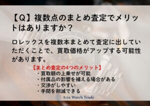 複数の時計を同時にお持ち込みいただくことで、買取金額を総額で優遇できる場合があります。特に、高額モデルや人気リファレンスを含む場合は、買取価格がアップする可能性が高くなります。
