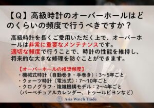 お客様がお持ちの高級時計を長くご愛用いただく上で、オーバーホールは非常に重要なメンテナンスです。適切な頻度で行うことで、時計の性能を維持し、将来的な大きな修理を防ぐことができます。