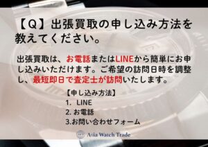 | ① 日程調整 ご希望の訪問日時を伺い、査定士のスケジュールを調整します。 ② 査定士が訪問 ご指定の場所で、時計の状態や付属品を確認しながら査定を行います。 ③ 買取成立・お支払い 査定額にご納得いただければ、その場で現金またはお振込みでお支払い。 |
